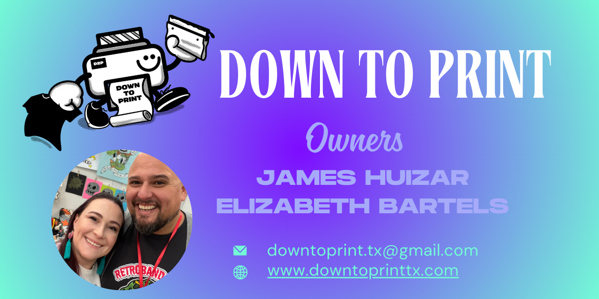 Down to Print is a husband and wife run print and fabrication shop in South Texas. Combining James’ 20+ years of professional art and 3D modeling experience with Elizabeth’s passion for seamless client connection, we offer custom apparel, signage, and props tailored to your vision. High-quality craftsmanship, simplified. Visit downtoprinttx.com to see their past projects and request a quote!